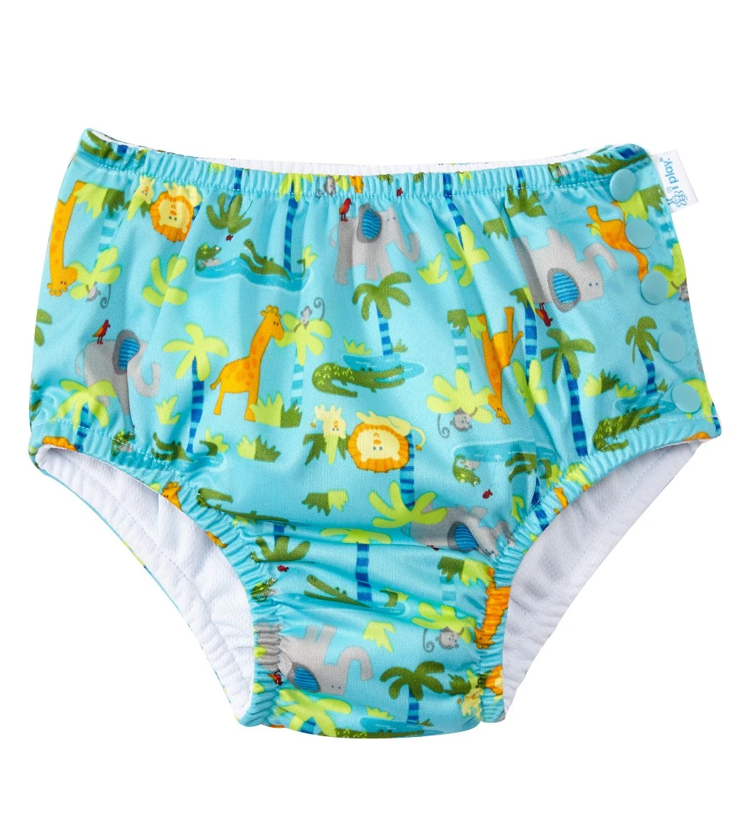 Keep him covered with the Jungle Snap Swim Diaper. These UPF 50+ swim bottoms are designed with a waterproof outer layer and a super absorbent inner layer for maximum protection and comfort.