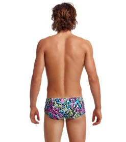 Train with flare and have fun in the Funky Trunks Men’s Blue Bars Jammer Swimsuit, featuring hip-to-knee coverage with contoured panelling, flatlock stitching, and front pouch lining.