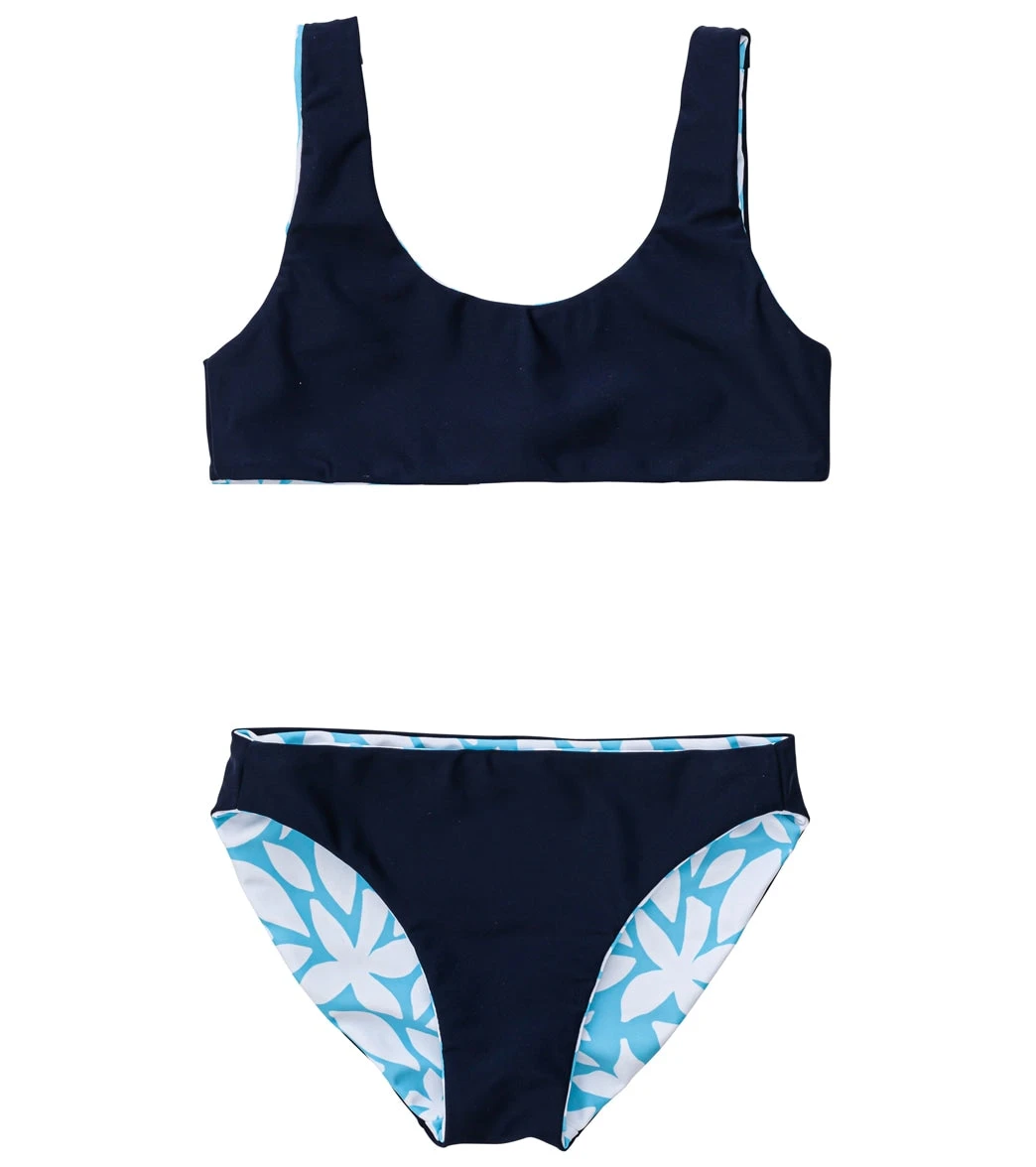 Surf, sun and fun! The Aqua Bloom Reversible Surf Bow Bikini is ready to hit the beach. Both the top and bottom are reversible, with The Aqua Bloom print on one side and deep navy on the reverse. Made from ECONYL regenerated nylon fabric, helping to clean up The oceans from fishing waste.A tween and teen favorite.