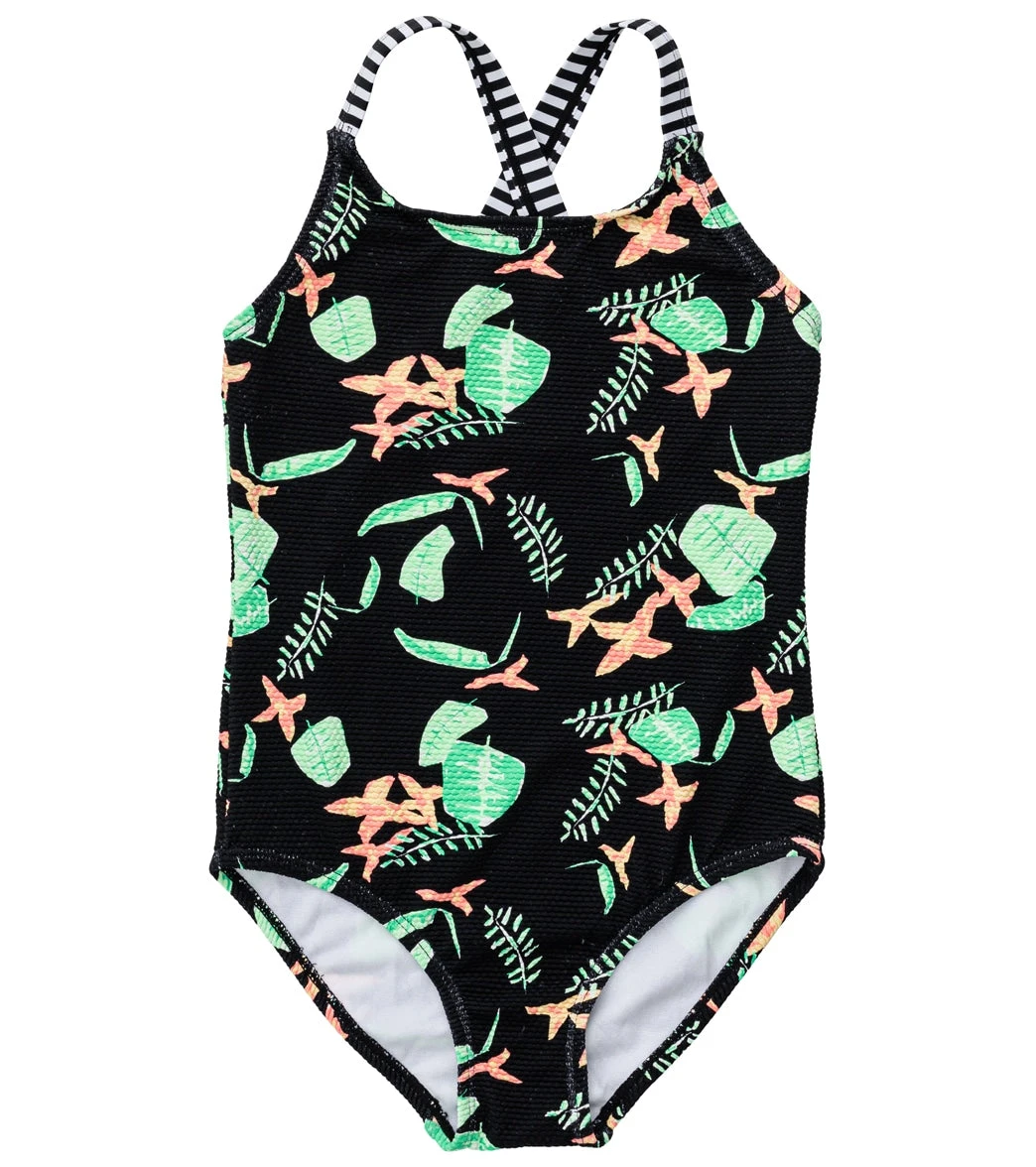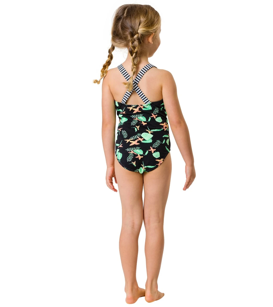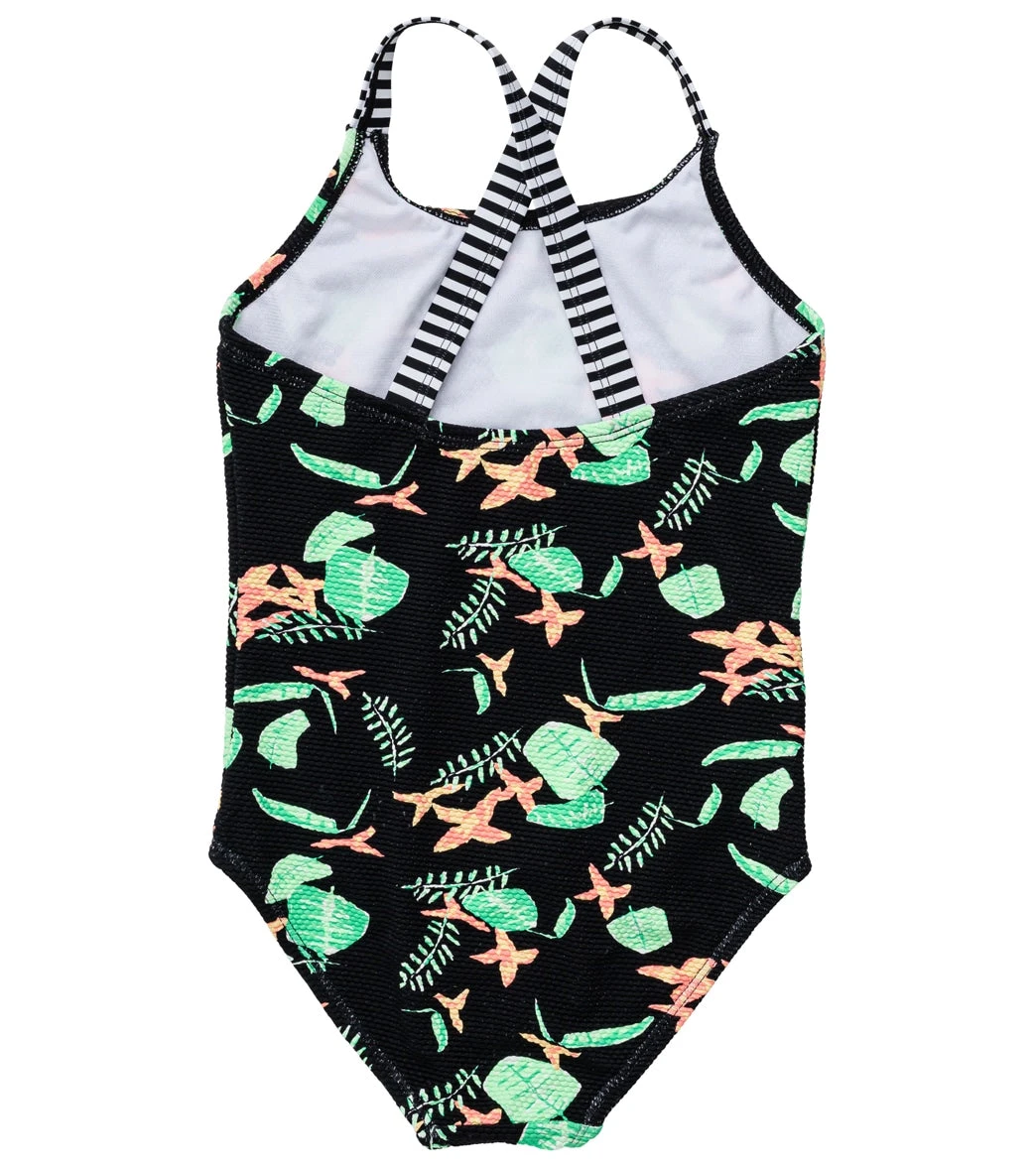Bold and Bright! The Neon Rainforest Cross Back Swimsuit is ready to hit the water. Featuring The signature Neon Rainforest print on unique textured ECONYL regenerated nylon fabric. Black and white stripe elastic straps add to this bold new look.
