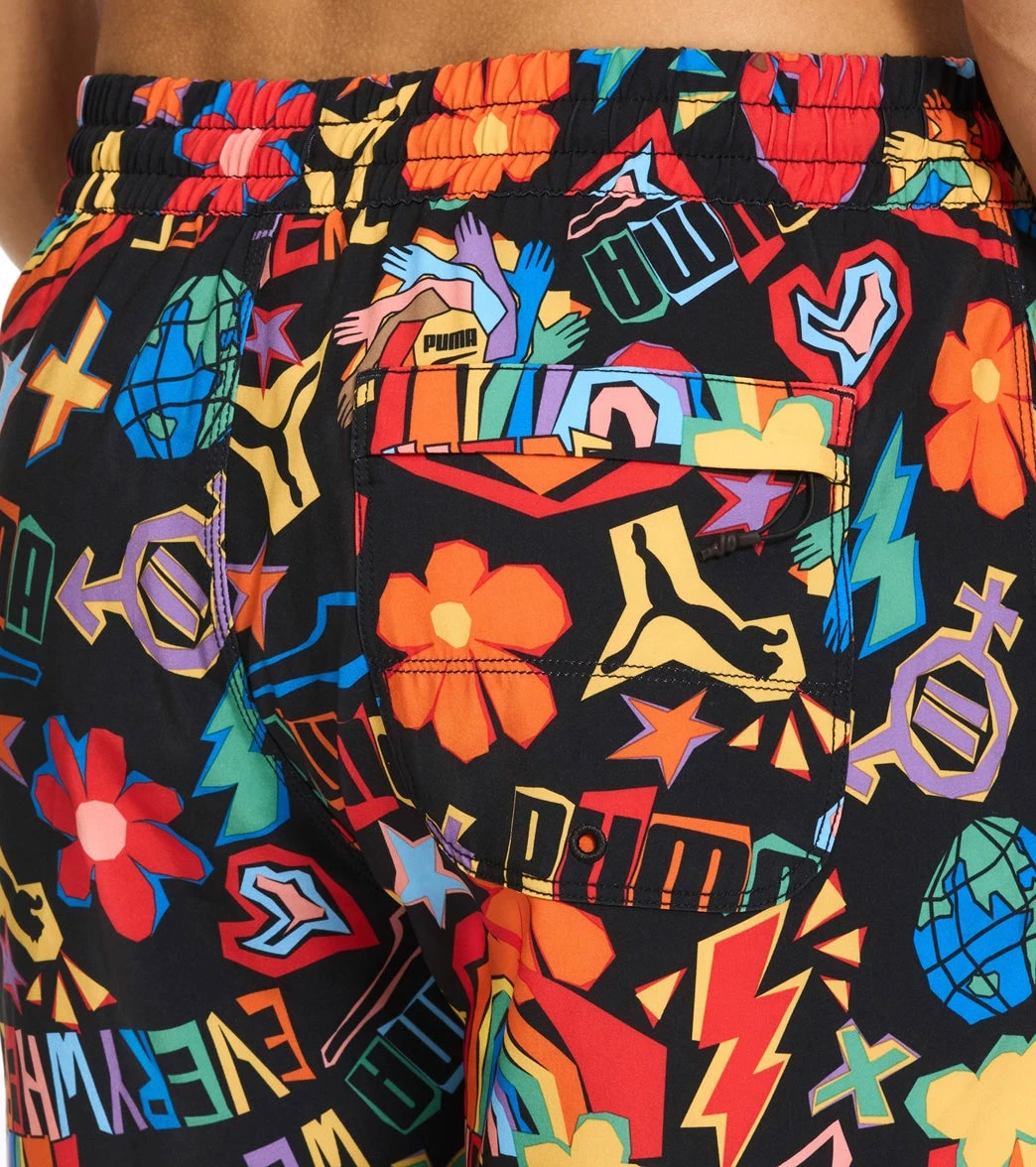 Stay moving and look sleek whether you’re training or relaxing in the Puma Men’s 5.5″ Pride Swim Trunks, featuring a mesh liner and water repellant fabric for excellent comfort and versatility.
